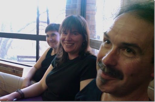 Funnily enough, I don't have any photos of us performing, but here's Liz, Jane and Peter just before we went on: